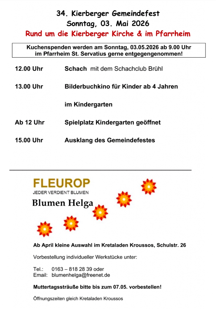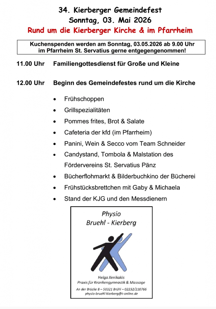 Alle Jahre wieder feiert die katholische Gemeinde das Kierberger Gemeindefest rund um unsere Kierberger Kirche St. Servatius. In diesem Jahr nun schon zum 34. Mal.