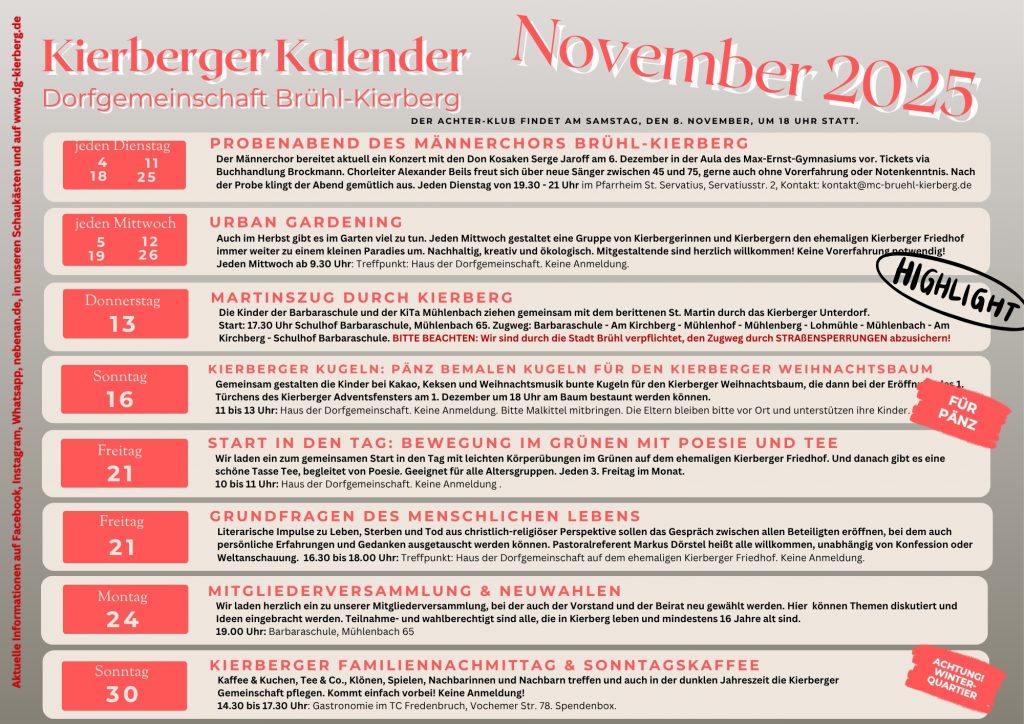 Die Weihnachtszeit wirft ihre Schatten voraus. Nächste Woche wird unser Kierberger Weihnachtsbaum aufgestellt und am 1. Dezember öffnen wir ab 18 Uhr das 1. Fenster des Kierberger Adventskalenders auf dem Parkplatz an der Talstraße.