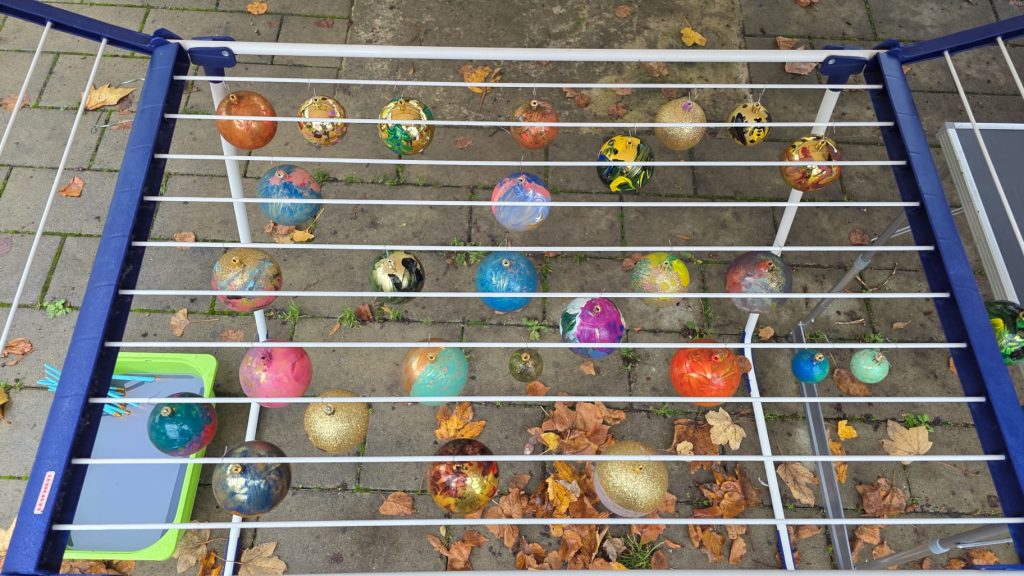 Punkt 11 Uhr standen die ersten Pänz auf der Matte unseres Häuschens auf dem ehemaligen Kierberger Friedhof, suchten sich eine Christbaumkugel aus und setzten sich an den Tisch, auf dem Pinsel, Paletten und verschiedenste Farben bereit lagen. Die bemalten Kugeln wurden auf einen Wäscheständer gehängt zum Trocknen gehängt. In den nächsten Tagen kommt wahrscheinlich noch eine Schicht Klarlack drüber.