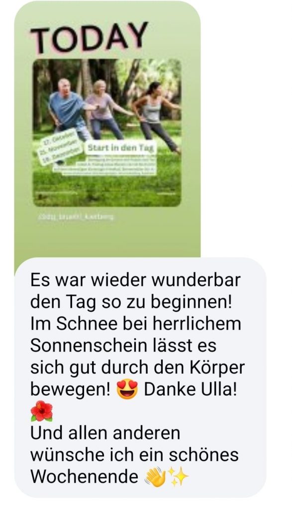 Eben erreichte uns eine Nachricht von der lieben Kierbergerin Renate, die heute morgen an unserem Bewegungsangebot „Start in den Tag“ auf dem ehemaligen Friedhof teilgenommen hat.