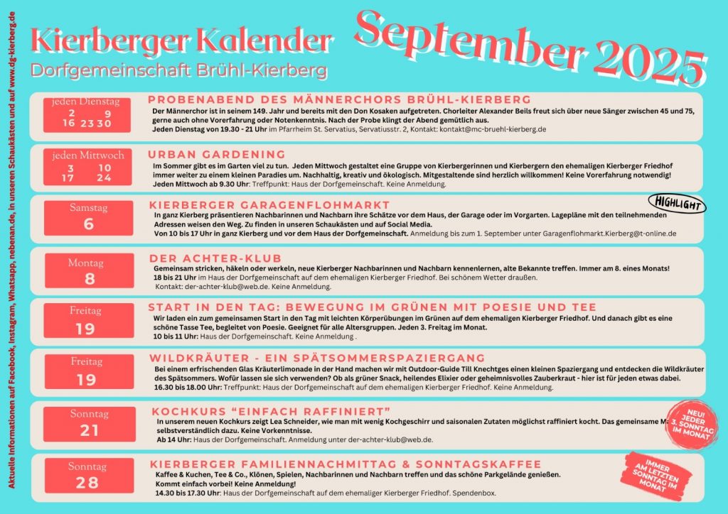 Selbstverständlich wird das gemeinsam Gekochte im Anschluss gemeinsam vor dem Haus der Dorfgemeinschaft auf dem ehemaligen Kierberger Friedhofverzehrt. Bei schlechtem Wetter natürlich drinnen. Also freut euch auf ein außergewöhnliches Kochereignis in der grünen Natur.
